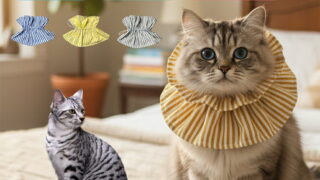 住まいのコンビニが提供するエリザベスカラーは、軽量で音がしにくい布製。コットン素材で肌に優しく、術後も快適に過ごせます。ご飯が食べやすく、寝やすい設計で愛猫の負担を軽減。丸洗いOKで衛生面も安心のストライプ柄です。