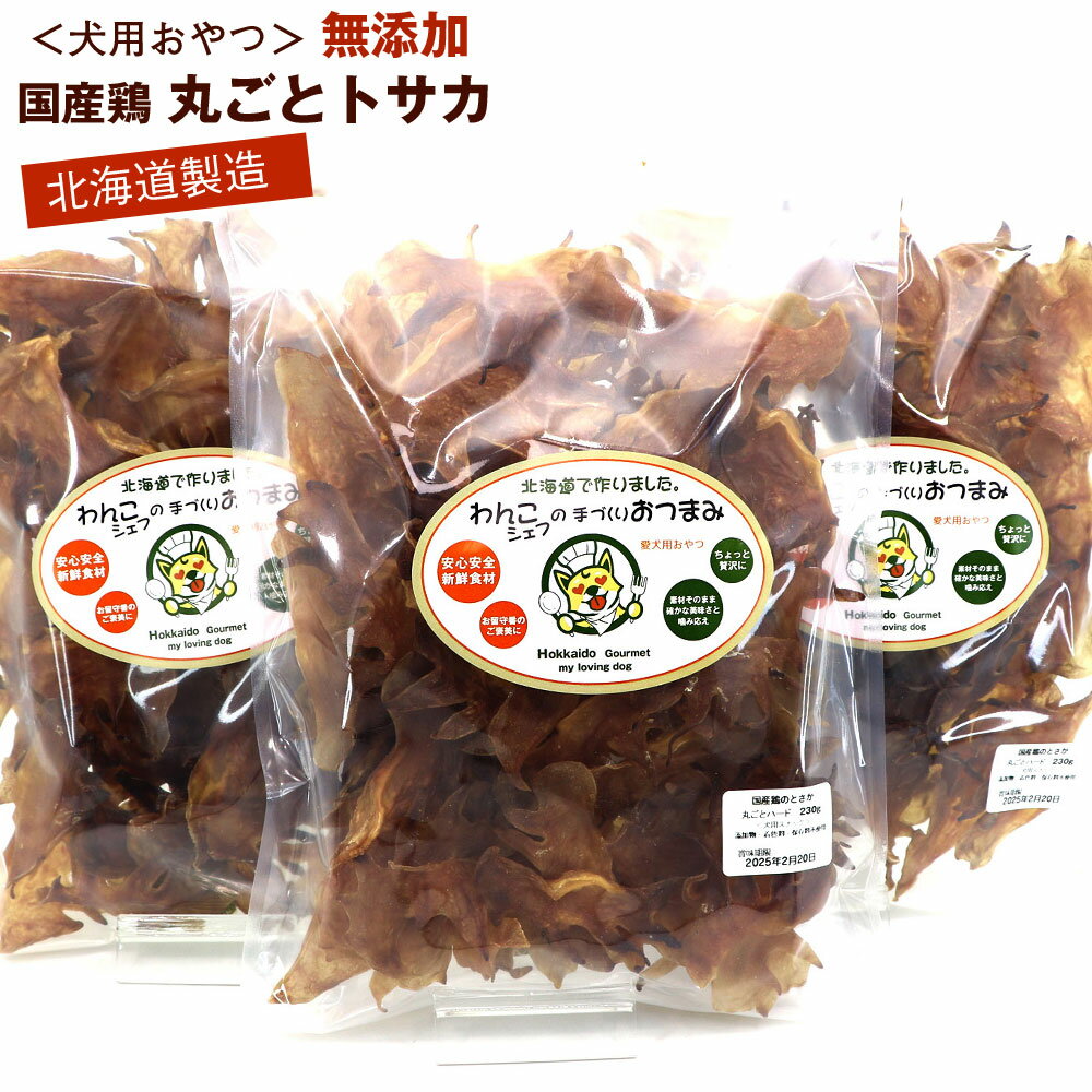 犬用おやつ 「わんこシェフの手づくりおつまみ」 国産鶏のとさか(鶏冠)ジャーキー (丸ごとタイプ) 北海道で製造しております。 厳選された国産原料のみを使用しています。 添加物・着色料・保存料は一切使用しておりません。 ※本商品は犬用で、間食用です。 ※愛犬の健康状態、年齢等を考慮したうえで、裏面表記の給与量を目安に1日1〜2回お与えください。 栄養成分(100g当たり)エネルギー398kcal、たん白質:70.5%以上、脂質:7.5%以上、粗繊維:0.5%以下、灰分:3.5%以下、水分:18.0%以下 関連キーワード:犬 おやつ 無添加 国産 とさか 犬 トサカ 犬 おやつ 鳥のトサカ 鳥のとさか 犬 鳥の鶏冠 鳥のトサカ 犬 鳥のとさか 犬 とさか おやつ 犬 トサカ犬 おやつ 国産 犬 おやつ ささみ おやつ 犬 無添加 おやつ 犬 国産 ドッグフード おやつ 無添加 国産 ドッグフード おやつ ジャーキー ペットフード おやつ 犬 ギフト対応OK(詳細はこちら)こちらもお薦め♪函館のイカはやっぱりおいしい! 「無添加あたりめ」駄菓子いか珍味の定番。 「するめソーメン」口寂しいとき、眠気覚ましに 「梅おやつ昆布」 商品情報 お召し上がり方 愛犬の健康状態、年齢等を考慮したうえで、裏面表記の給与量を目安に1日1〜2回お与えください。 販売者 函館えさん昆布の会 (株)さいとう北海道内屈指の昆布産地「えさん」の昆布漁師と販売会社 (株)さいとうとで設立した事業です。 献上昆布で知られる高級出し昆布「真昆布」、驚きのネバネバ昆布「がごめ昆布」をはじめ、ふのり、銀杏草など漁師町ならではの田舎の希少食材をご提供しております。 内容量 230g×3袋 業務用 賞味期限(製造日から) 365日 原材料名 鶏とさか(国産) 配送方法 保存方法 直射日光、高温多湿を避けて常温にて保存ください。 開封後の注意点 開封後は必ずチャックを閉じて冷蔵庫で保存し、賞味期限に関わらずなるべく早くお与えください。 お召し上がりの前に 愛犬の健康状態、年齢等を考慮したうえで、裏面表記の給与量を目安に1日1〜2回お与えください。