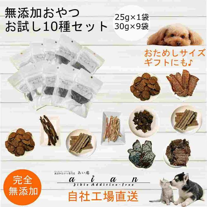 A. 愛犬・愛猫に安心して与えられる無添加おやつを10種類厳選したセットです。飽きずに楽しめるバラエティ豊かな内容です。
