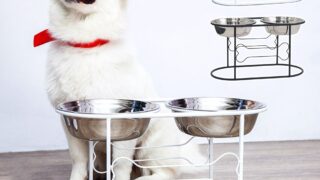 キラキラハイムの犬用フードボウル。高さのあるスタンドタイプで、食べやすい。水入れもセットで、給餌器として使用可能。大型犬に最適。ホワイト・ブラックの2色展開。5/1限定最大50%OFFクーポン配布中!